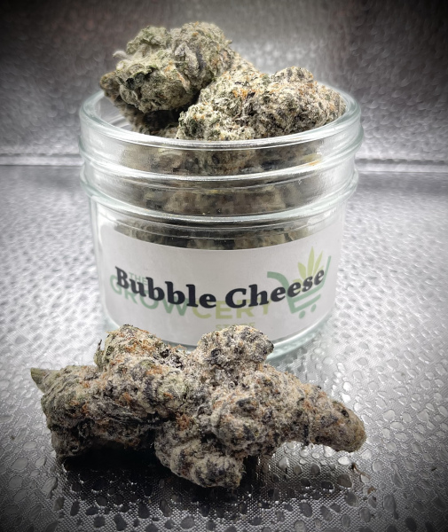 Bubble Cheese offers the user a sedating buzz that starts in the forehead and back of the head and spreads slowly throughout the body, ebbing in mellow waves of lethargy. This down-tempo buzz leads to utter relaxation, deep introspection, and a warming, pain relieving feeling. Due to these effects, Bubble Cheese is ideal for treating insomnia, muscle spasms, depression, and chronic pain. Bubble Cheese buds have small grape-shaped dark olive green fuzzy nugs covered with dark green leaves and beautiful thin amber hairs. These nugs are dusted with fine almost translucent trichomes and a visible layer of sweet, sticky resin.